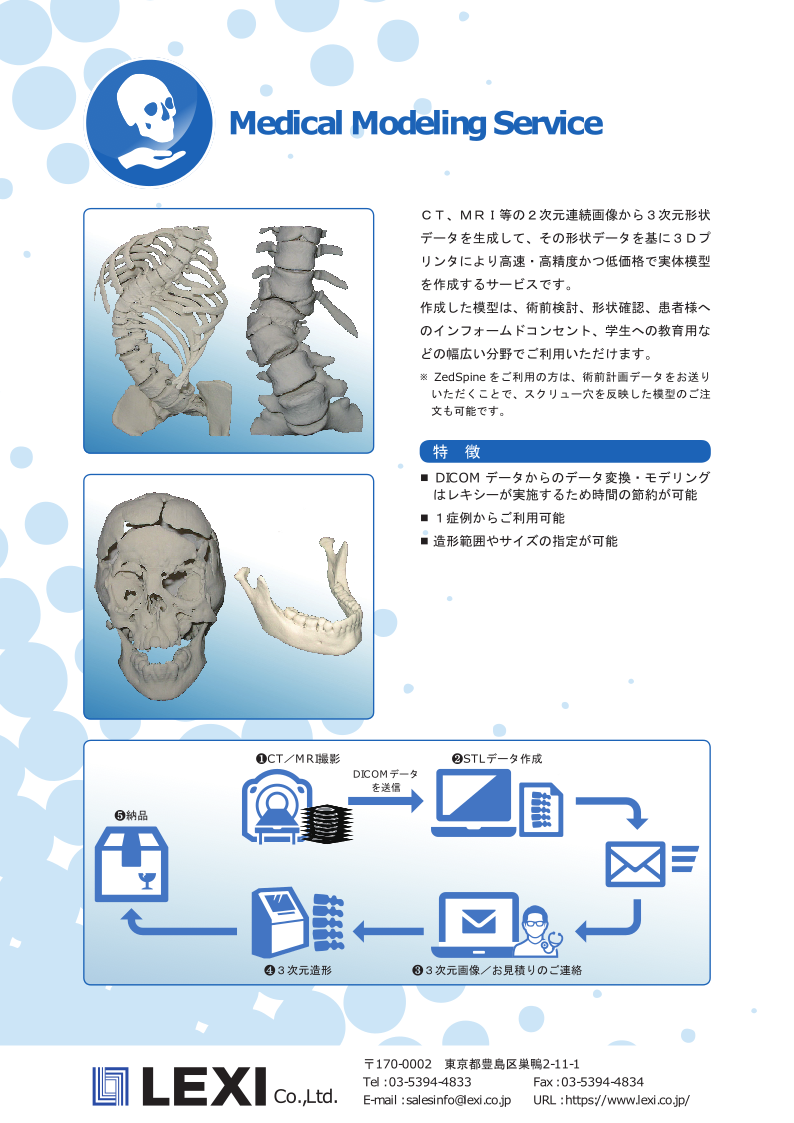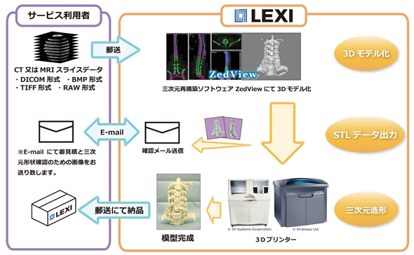 Medical Modeling Serviceは、CTやMRIなどの2次元スライス画像から3次元形状データを生成して、その3次元形状データを基にラピッドプロトタイピング技術により高速・高精度かつ低価格で実物大立体モデルを作成するサービスです。