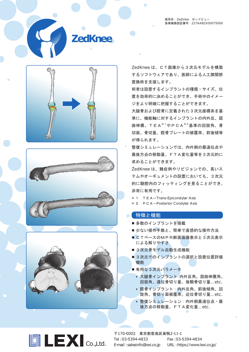ZedKneeは、症例毎にCT画像より緻密な3次元モデルを再構築し、各種人工関節コンポーネントの設置位置やサイズ、それに必要な骨切除量を3次元的にシミュレーションすることができます。
