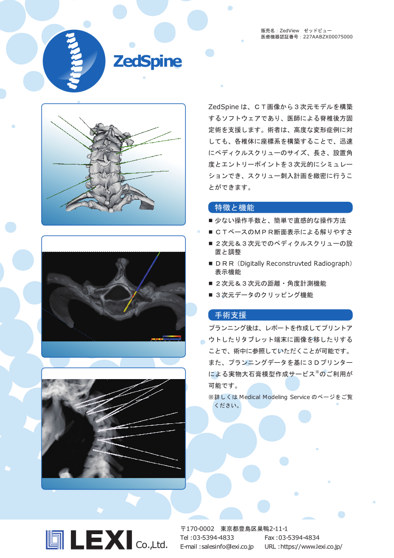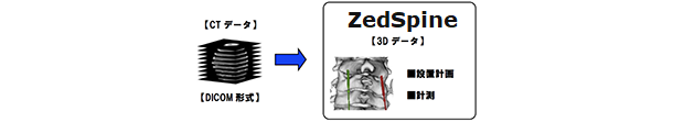 ZedSpineはCT画像を用いた脊椎後方固定術用の3次元術前計画ソフトウェアです。術者は15分程度の短時間で簡単にペディクル・スクリューの刺入点、径などをはじめ、3次元的な設置位置検討などの術前計画を行うことが可能です。